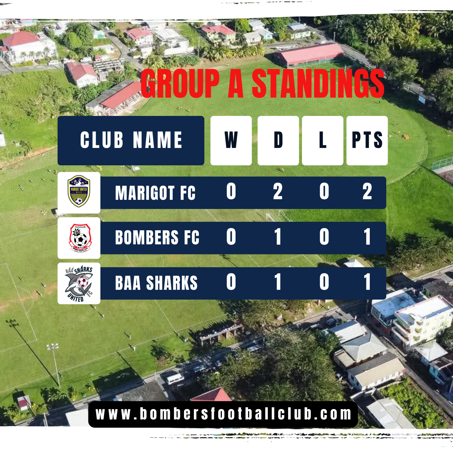 Marigot FC currently sits at the top of Group A with 2 points after two drawn matches. Close behind are Bombers FC and BAA Sharks, both with 1 point each after drawing their opening fixtures.