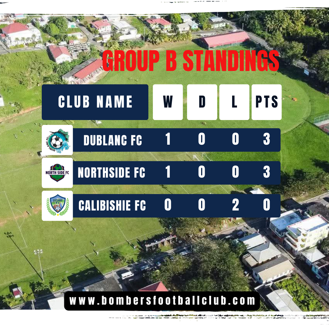 In Group B, both Dublanc FC and Northside FC have made strong starts, each winning their opening match and sitting on 3 points. Meanwhile Calibishie FC has lost both of their matches and currently sits at the bottom of the group.